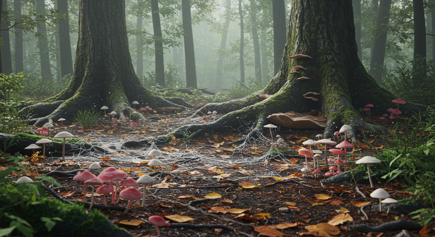 Debaixo de nossos pés, estende-se uma vasta rede de filamentos fúngicos — os micélios — que conecta árvores, raízes e microrganismos em uma intricada malha de cooperação subterrânea. Popularmente conhecida como “internet da floresta”, essa rede atua não só na decomposição da matéria orgânica e no transporte de nutrientes, mas também como mediadora de comunicação entre plantas, fenômeno amplamente demonstrado por Suzanne Simard (Simard et al., 1997) e difundido ao grande público por Peter Wohlleben em A Vida Secreta das Árvores (Wohlleben, 2015).