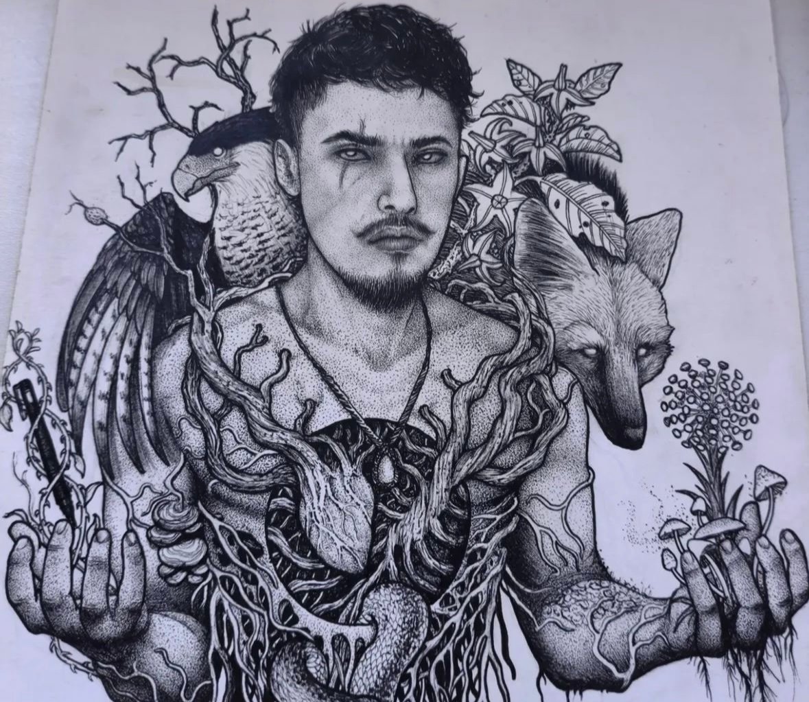 Gabriel Oliveira nasceu no coração do Tocantins, mas foi o Cerrado que o adotou como filho. Aos 26 anos, ele carrega nos traços o vigor desse bioma resistente, transformando raízes, galhos e animais em poesia visual. Artista visual, tatuador e engenheiro florestal pela Universidade Federal do Tocantins (UFT), construiu uma jornada onde ciência, ancestralidade e arte se entrelaçam como cipós.
